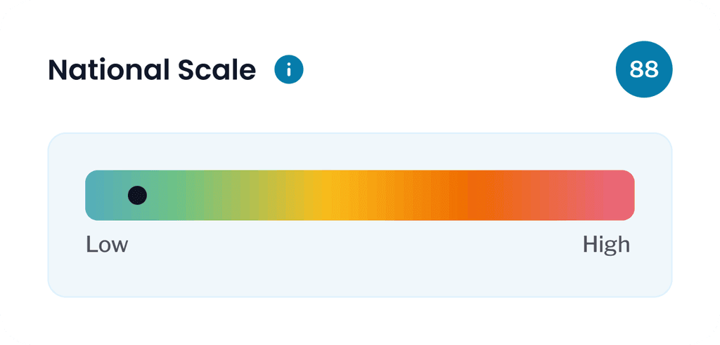 The national or state scale shows the full range of indicator values across Australia (national view) or the selected state (state view) from the lowest values on the left (represented by blue) to highest values on the right (represented by pink) with the average value in the middle (represented by yellow). A black dot on the scale marks the selected area’s position on the scale, with its exact value displayed next to it.