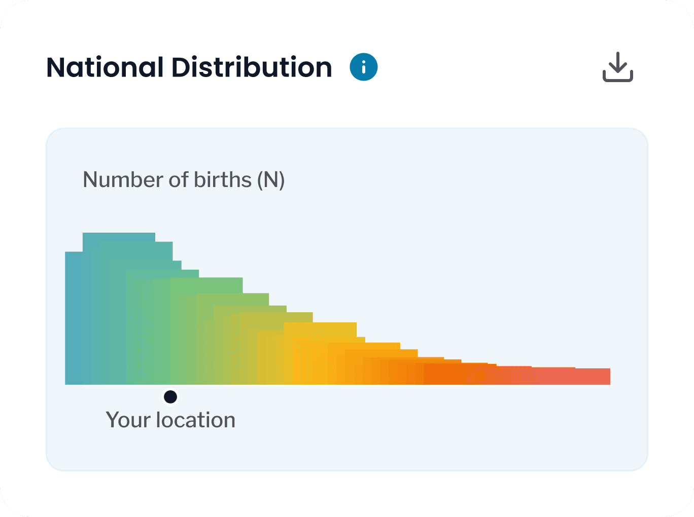 The distribution chart displays the range and frequency of values observed across Australia (national view) or the state (state view). The height of each bar in the chart corresponds to the number of areas with values within a set interval, i.e. a tall bar represents lots of areas with similar scores, while a low bar represents fewer areas with similar scores. The black dot below highlights the chosen area’s value in this range.